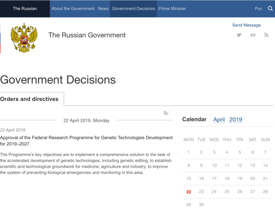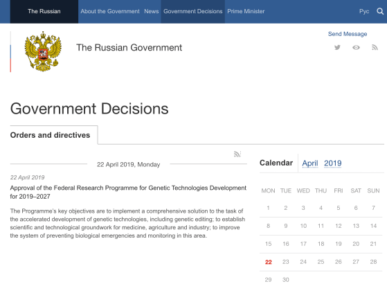 RUSSIA (4-22-19): Federal Research Program for Genetic Tech. Development for 2019–27, Approved—