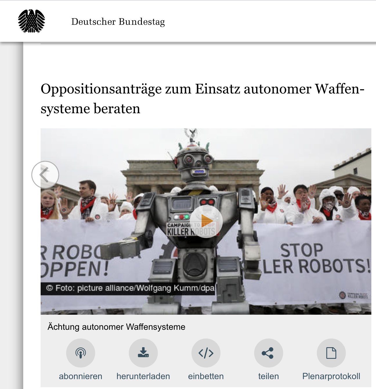 “The Bundestag debated on Friday, January 31, 2020, about the use of autonomous weapon systems that can be controlled by artificial intelligence. Applications from the Alliance 90 / The Greens and the Left faction were rejected.