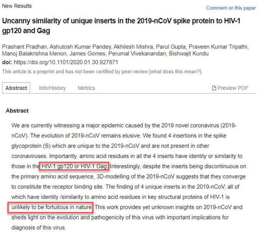 “Indian researchers scanned the novel coronavirus genome and found unique cell identification and membrane binding proteins located in the HIV genome, suggesting the 2019-nCov is a laboratory-made chimera, but withdrew their findings after receiving pressure from China.