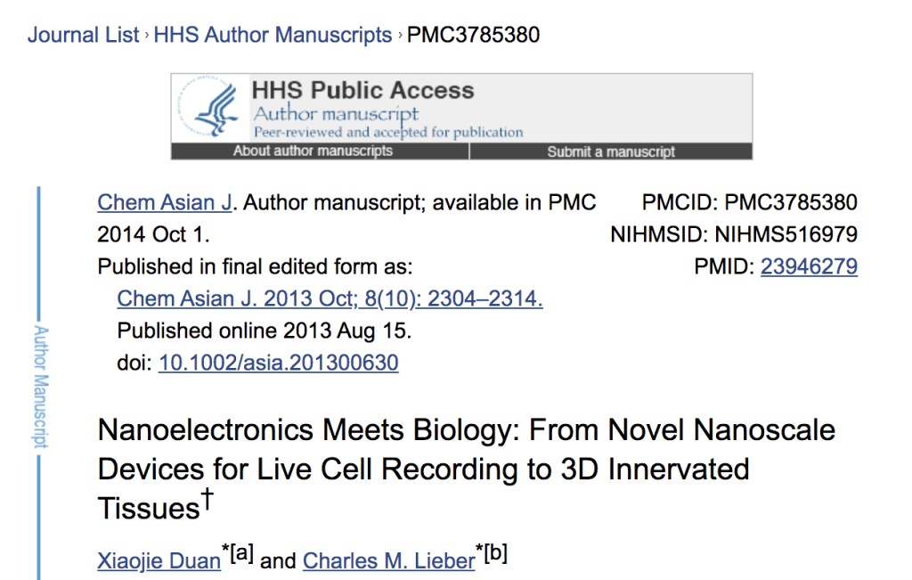 In August of 2013, Lieber published a research paper titled, Nanoelectronics Meets Biology: From Novel Nanoscale Devices for Live Cell Recording to 3D Innervated Tissues. His co-worker was Xiaojie Duan, from the Department of Biomedical Engineering, College of Engineering, Peking University, Beijing, China.
