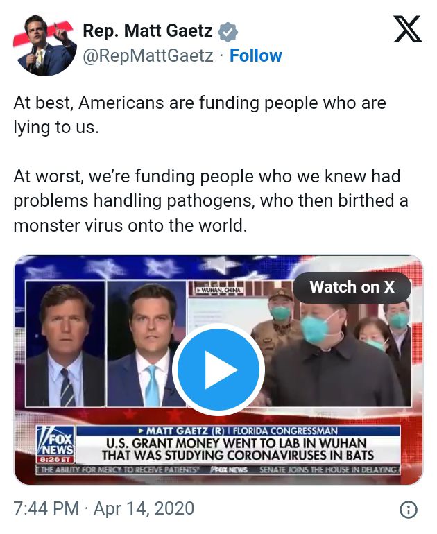 Florida’s Republican representative, Matt Gaetz, made it clear that American taxpayer money was redistributed to China’s Wuhan lab which researched certain coronavirus strains.